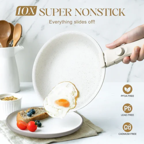 Bộ chảo chống dính granite tay cầm tháo rời giúp tiết kiệm 75% không gian lưu trữ, lý tưởng cho bếp nhỏ và du lịch. Gồm chảo 8” – 9.5” – 11” + tay cầm tháo rời, linh hoạt từ bếp đến lò nướng, bàn ăn và tủ lạnh.