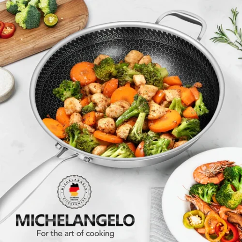 Chảo wok inox tổ ong MICHELANGELO ứng dụng công nghệ khắc bề mặt tiên tiến, kết hợp inox cao cấp và lớp chống dính giúp dẫn nhiệt nhanh, tỏa nhiệt đều và hạn chế bám dính. Bề mặt chịu dụng cụ kim loại, chống trầy xước, dễ vệ sinh, dùng được với máy rửa chén.
