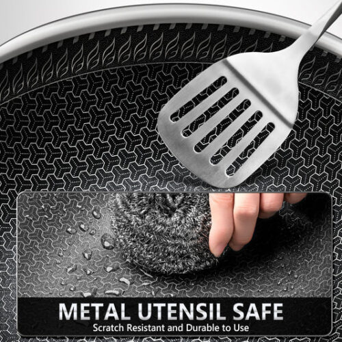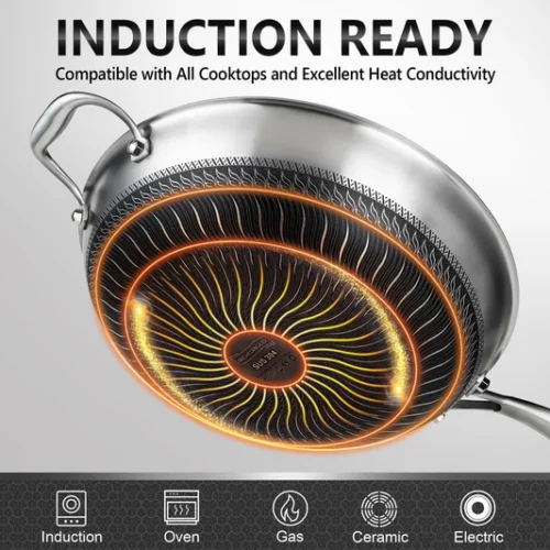 Chảo wok inox tổ ong MICHELANGELO ứng dụng công nghệ khắc bề mặt tiên tiến, kết hợp inox cao cấp và lớp chống dính giúp dẫn nhiệt nhanh, tỏa nhiệt đều và hạn chế bám dính. Bề mặt chịu dụng cụ kim loại, chống trầy xước, dễ vệ sinh, dùng được với máy rửa chén.